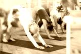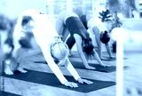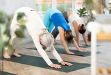 European sport women who take care of their physical health and do yoga in a fitness studio practice the dog pose face down .during a group workout