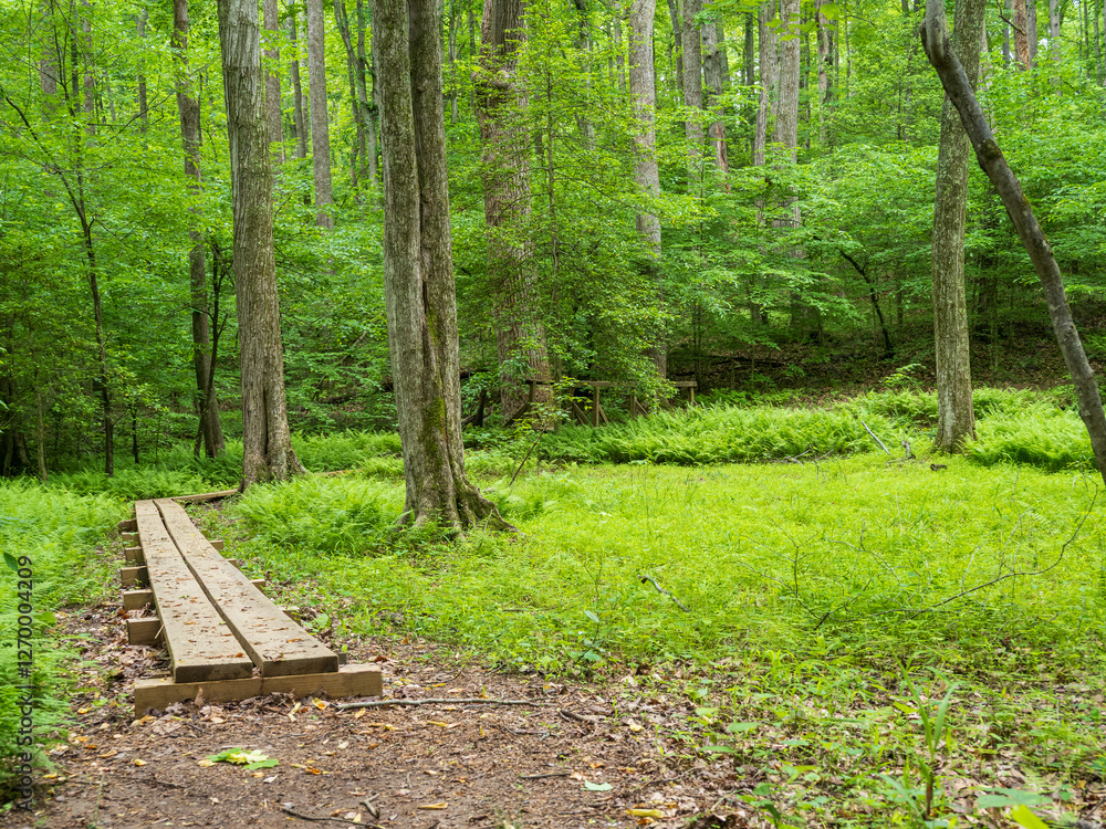 Wooden walking boards run through the lush forest greenery in Prince William Forest Park, Virginia.