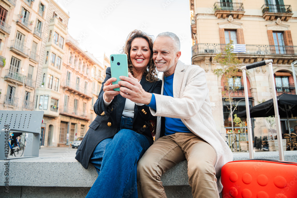 Happy mature couple booking their vacations or looking for directions with a smartphone while enjoying their time together during a travel in a european city, capturing joyful memories on their trip.