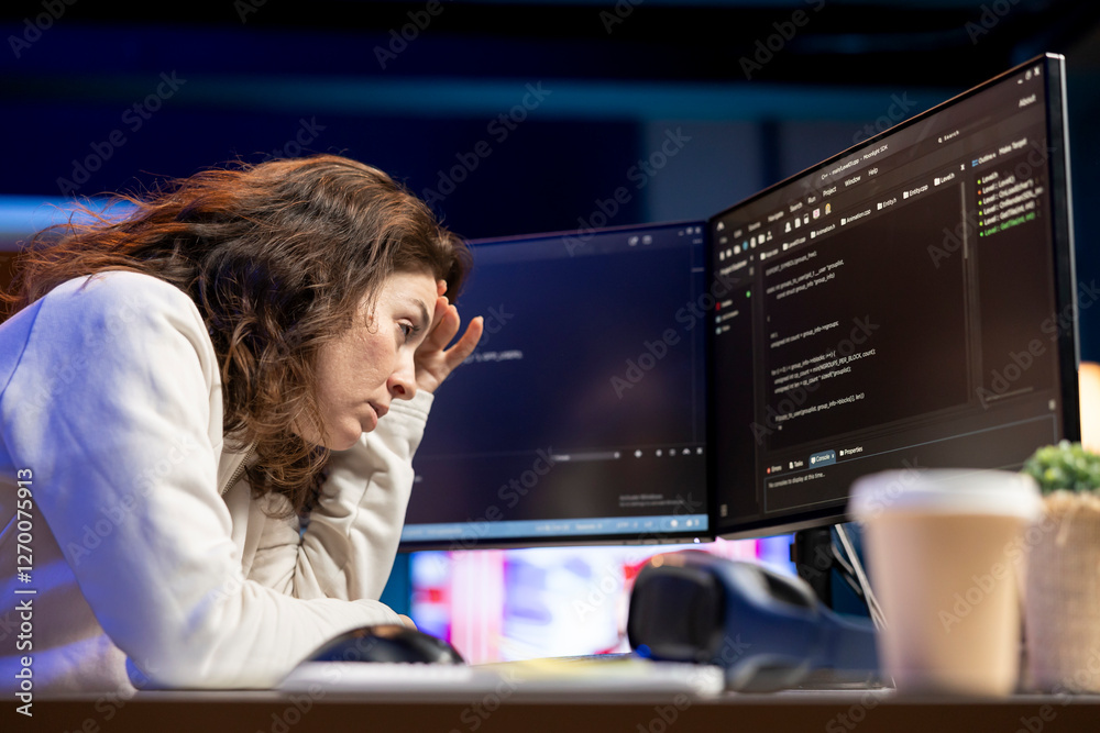 Tired woman hurting from too much stress accumulated while doing software quality assurance, reading source code on computer. Engineer suffers from headache after inspecting coding on PC for too long