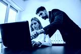Business colleagues collaborating in an office environment, with a male professional pointing at a laptop screen while assisting a female coworker, representing teamwork, productivity at workplace