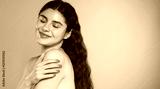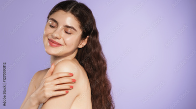 Portrait of woman after shower, has glossy, shiny hair, dewy look, hydrating skincare routine to protect facial barrier, purple background