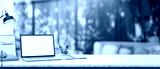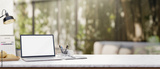 A laptop, stationery, and decorative items placed on a white table with a blurry background.