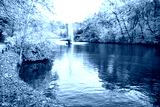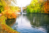 Fountain in park with colorful trees