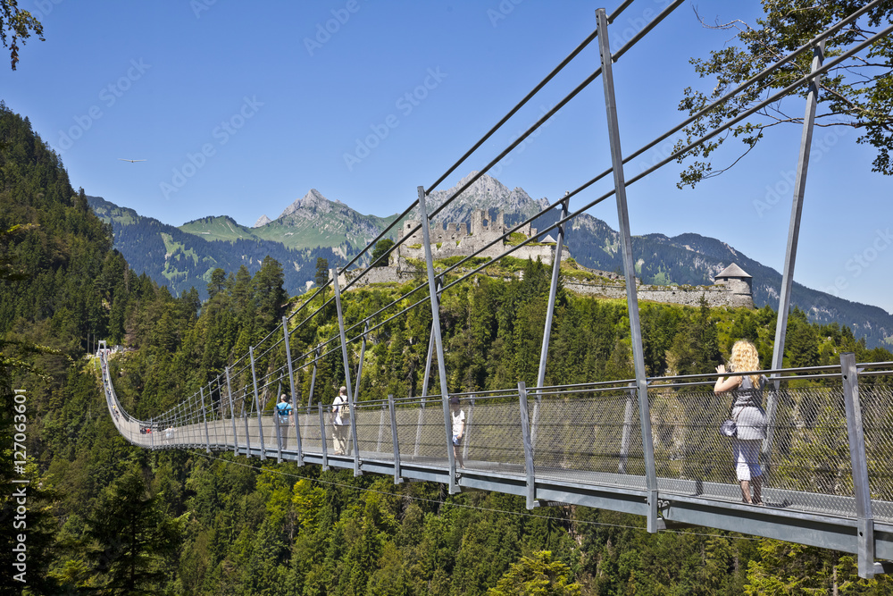 Hängebrücke mit Burgruine Ehrenberg bei Reutte, Österreich.