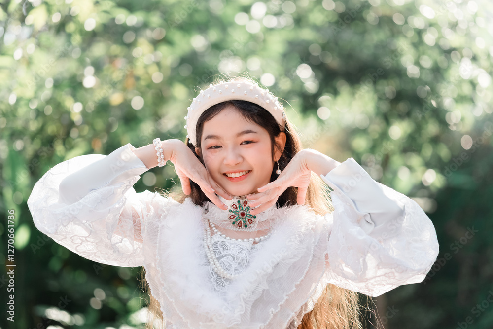 Joyful young girl posing outdoors nature setting portrait photography bright environment