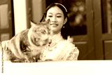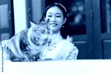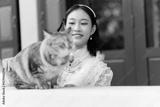 Woman enjoying playful cat in colorful outdoor setting lifestyle photography joyful moment