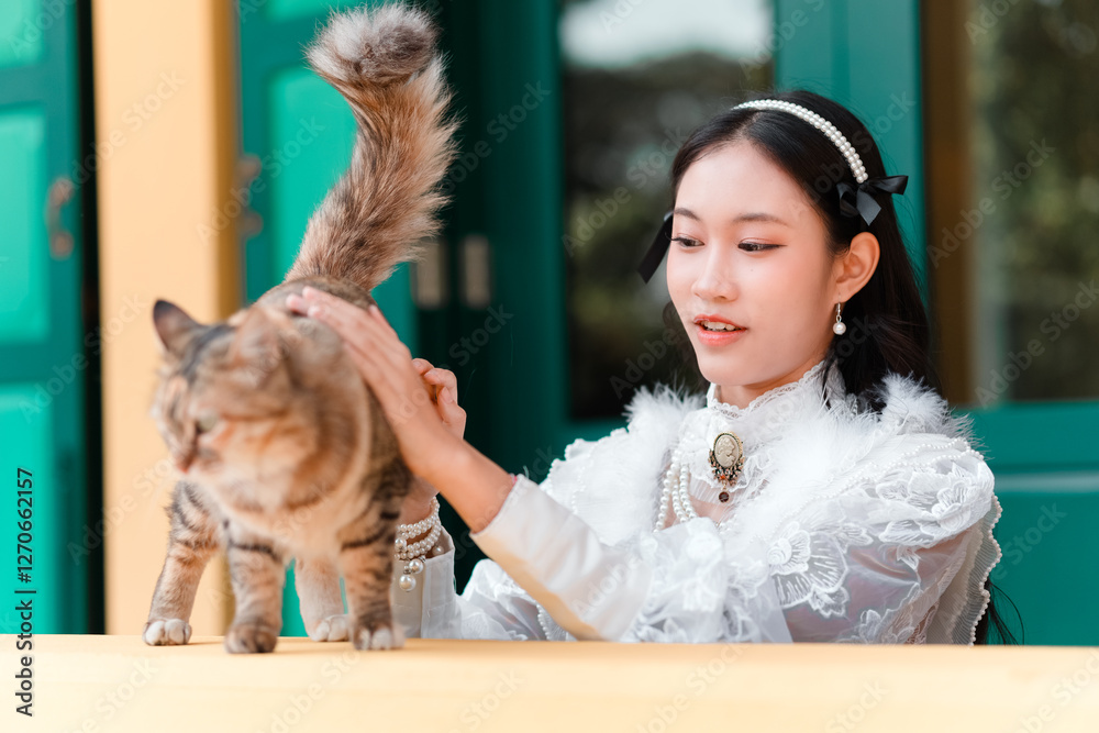Close-up of elegant woman with cat in outdoor natural environment lifestyle photography