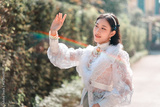 Joyful gesture by a young woman in a lush garden lifestyle photography outdoor serenity