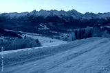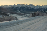 A snow-covered parking lot at a ski resort in the mountains on a frosty morning