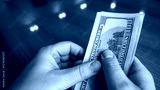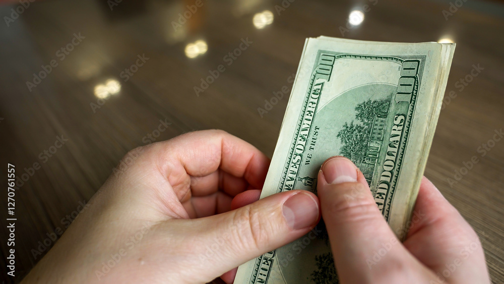 A person carefully counts a stack of hundred dollar bills on a polished wooden table. Soft, natural light highlights the texture of the currency and the person's hands.