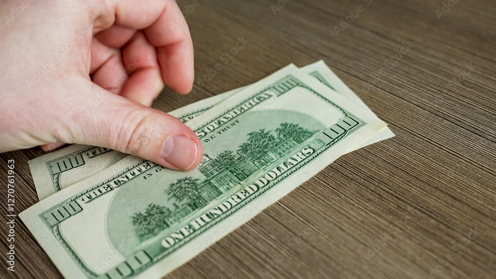 A hand holds several one hundred dollar bills, placing them carefully on a smooth wooden table. This moment captures the act of managing cash, indicating a transaction.