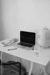 Elegant and tidy desk setup with laptop, writing accessories, and unique paper lamp design