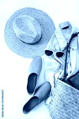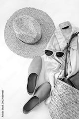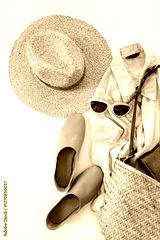 Minimalist Summer Outfit Essentials with Straw Hat, Bag, Sunglasses, Linen Shirt, Wallet and Leather Shoes in Earthy Tones