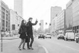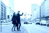 Young beautiful couple in love outdoor in the city back light, asking for a taxi - hitchiker, commuter, couple concept
