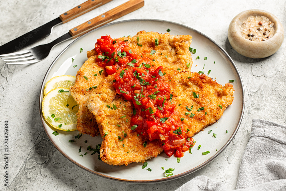 Turkey schnitzel, cutlets, scaloppini, turkey breast, breaded and fried, made from turkey breast, served with tomato and red bell pepper sauce, parsley.