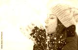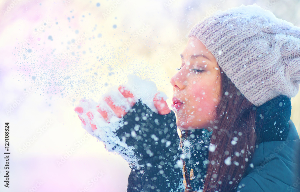 Beauty winter girl blowing snow in frosty winter park