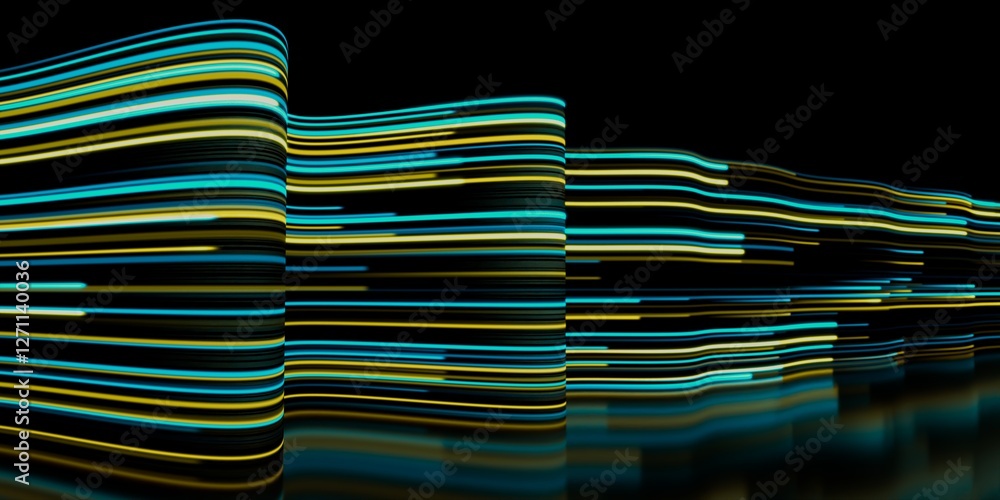 Abstract Flowing yellow blue green Lines on Curved Surfaces, Modern Futuristic Design, 3D Render