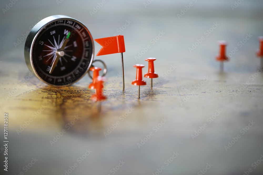 Compass and Red Pins on Map Indicating Travel Planning and Exploration Destination