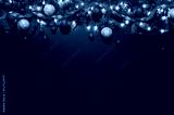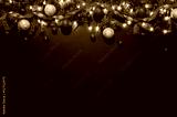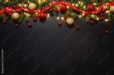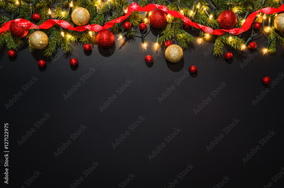 Christmas decoration background over black chalkboard, top view. Horizontal photo of decorations taken from above with copy space for text and other web or print design elements.
