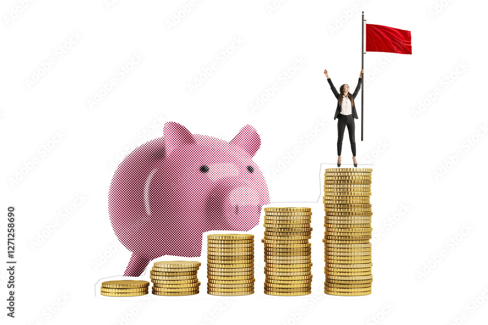 Businesswoman on top of stacked coins with red flag, piggy bank in background, isolated on white. Concept of financial success and savings