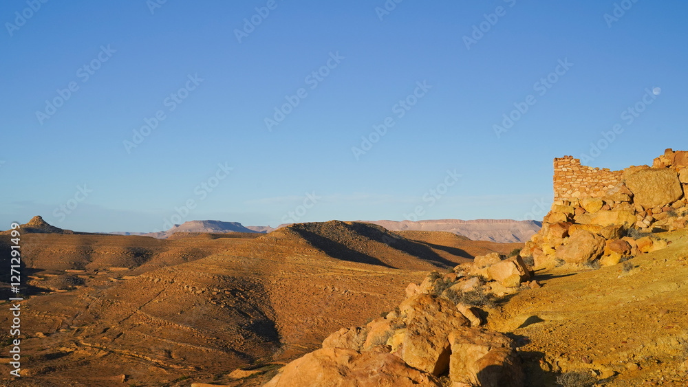 Ksar Beni Barka e,Al Barka Moschea,tipico villaggio Berbero costruito sulla cima di una montagna rocciosa costituito da abitazioni e magazzini per il cibo. Tataouine,Tunisia