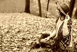 Outdoor full body portrait of a young beautiful fashionable girl posing in the park. Model looking aside. Lady wearing stylish autumn clothes. Toned. Copy space for text