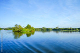 View of Lake Kemnader and the surrounding green nature in the Ruhr area. Landscape at the Ruhr reservoir near Bochum and Hattingen. Kemnader See.