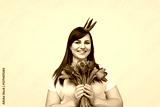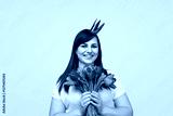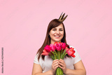 A cheerful woman wearing a golden crown holds a bouquet of vibrant tulips, smiling warmly on a pink background, exuding positivity and happiness.