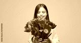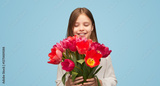 Charming little girl wearing white shirt and standing with eyes closed on blue background and holding bunch of bright flowers