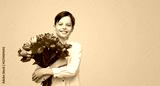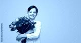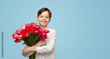 Happy little boy in white shirt embracing big bunch of blooming spring tulips for 8 March holiday smiling at camera