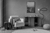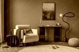 A cozy reading corner with a woven chair, soft textiles, and a minimalist console table. Earthy tones and warm lighting create a serene and inviting atmosphere.