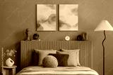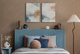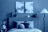 A wider perspective of the blue-toned bedroom, featuring sculptural decor pieces, a floor lamp, and soft lighting that enhances the serene ambiance.