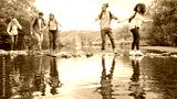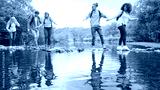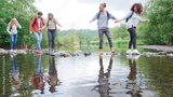 Multi-Cultural Group Of Young Friends Crossing River On Stepping Stones Hiking In UK Lake District