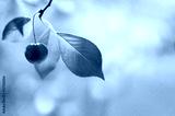 One cherry on a branch with leaves in the sun on a beautiful soft green background. Background for postcards or design.