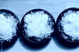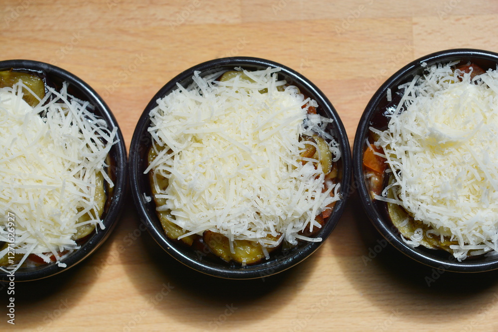 Three small, dark-colored bowls arranged in a row, each filled with a dish featuring eggplant as a main ingredient and topped with shredded cheese, set against a light wood background