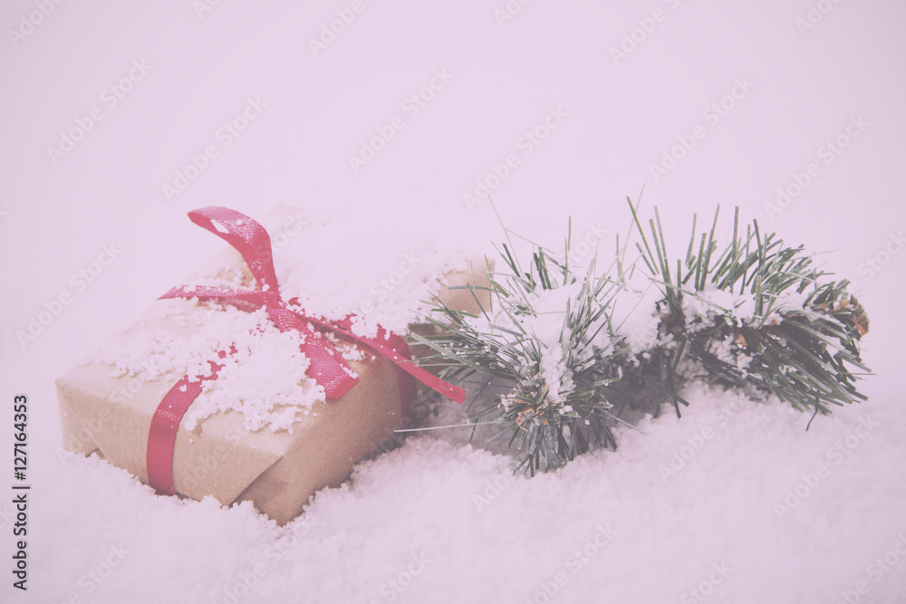 Christmas presents in brown paper with red ribbon Vintage Retro