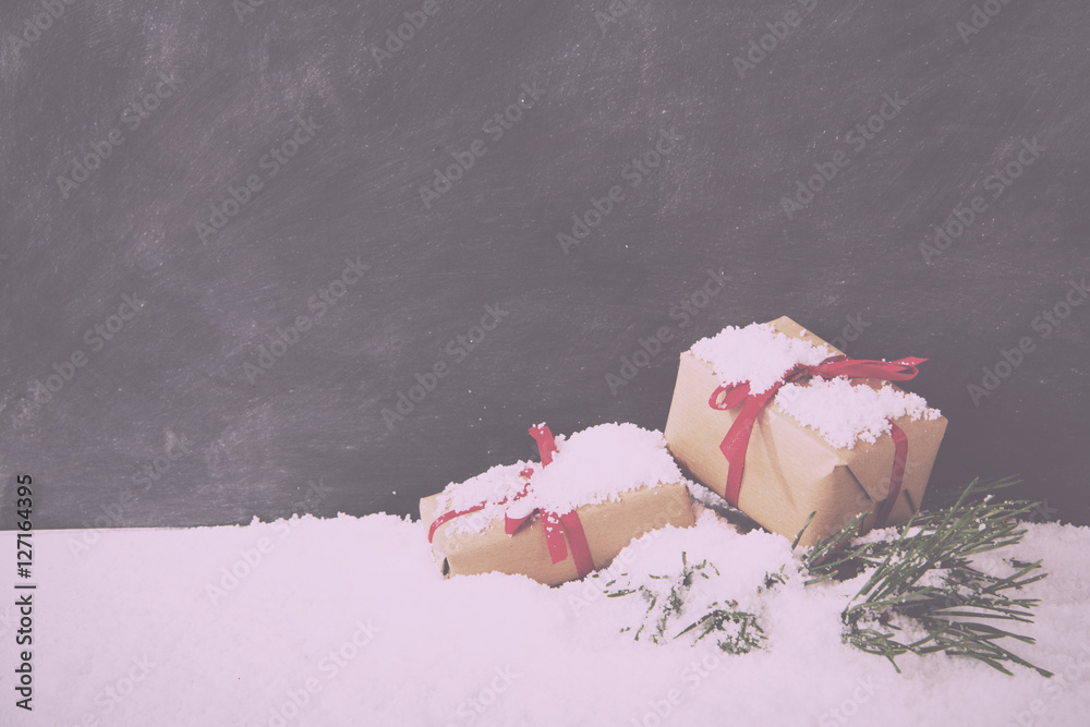 Christmas presents in snow against a blackboard Vintage Retro Fi