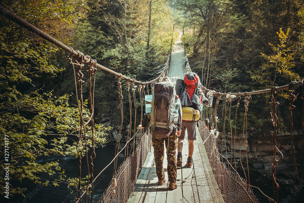 Travelers crossing through hanging bridge in good sunny day over the lake