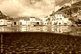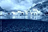 Underwater split photo of crystal clear emerald beach and traditional settlement of Seralia built by the sea below iconic Castle or Kastro village, Sinfos island, Cyclades, Greece