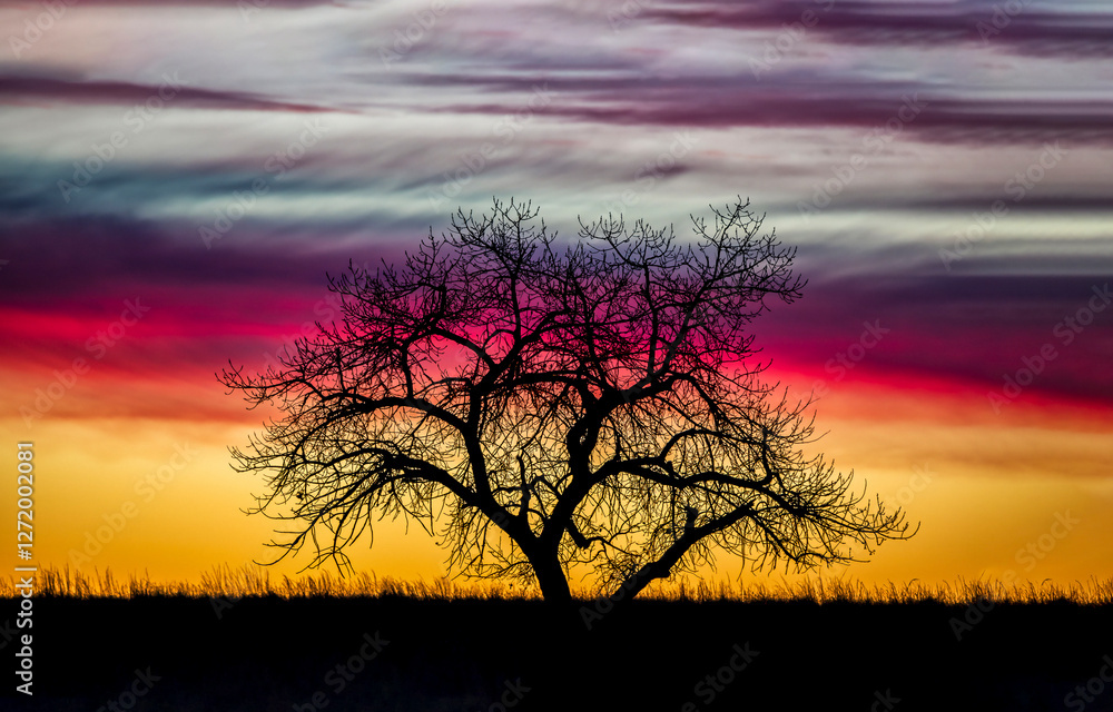Sunset tree silhouette. Lonely tree silhouette at beautiful sunset