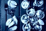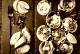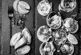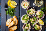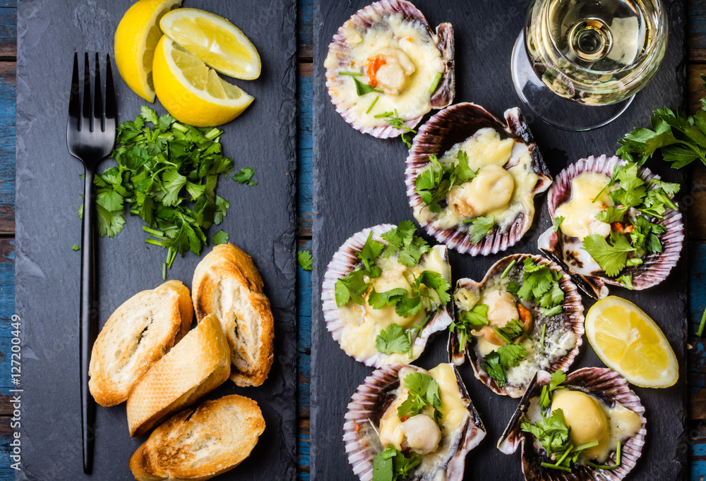 Baked scallops on slate with lemon, cilantro, bread white wine