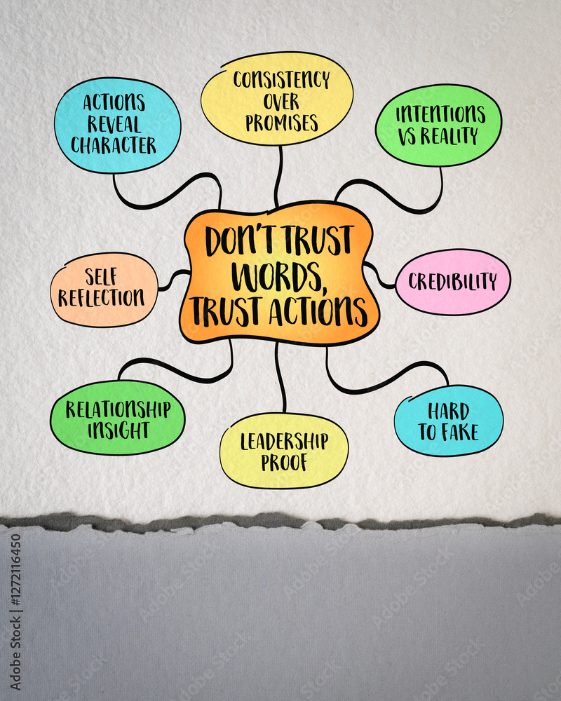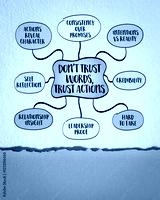 Don't trust words, trust actions, evaluating people intentions and character based on their behavior rather than what they say. Infographics sketch.