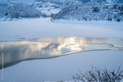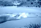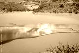 partially frozen Horsetooth Reservoir in Colorado foothills at dusk