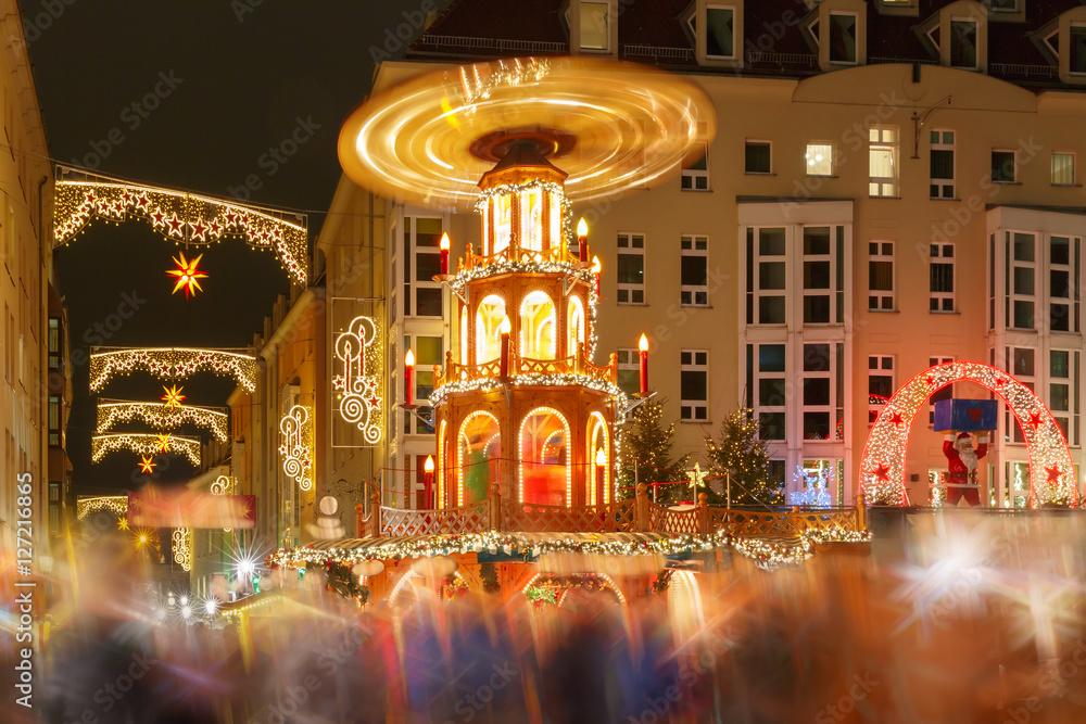 Decorated and illuminated Christmas street with carousel at night in Dresden, Saxony, Germany