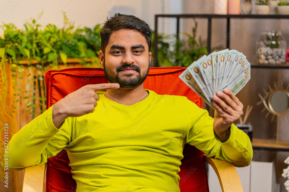 Happy rich business Arabian man counting money cheering up with high profits, celebrate lottery game win, satisfied of wealth income earnings salary, pointing finger on dollars cash in hand at home