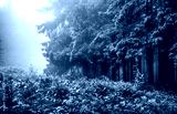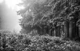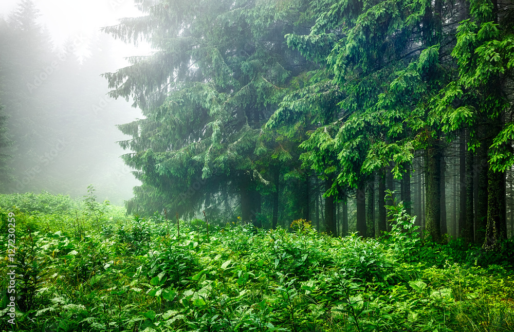 Landscape of forest edge with green branches fir-trees