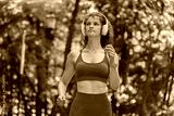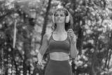 Active sportswoman jogging training marathon run, listening to music in wireless headphones. Workout cardio outside in park at morning. Young girl enjoying healthy lifestyle. Female athlete jogger.