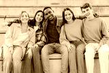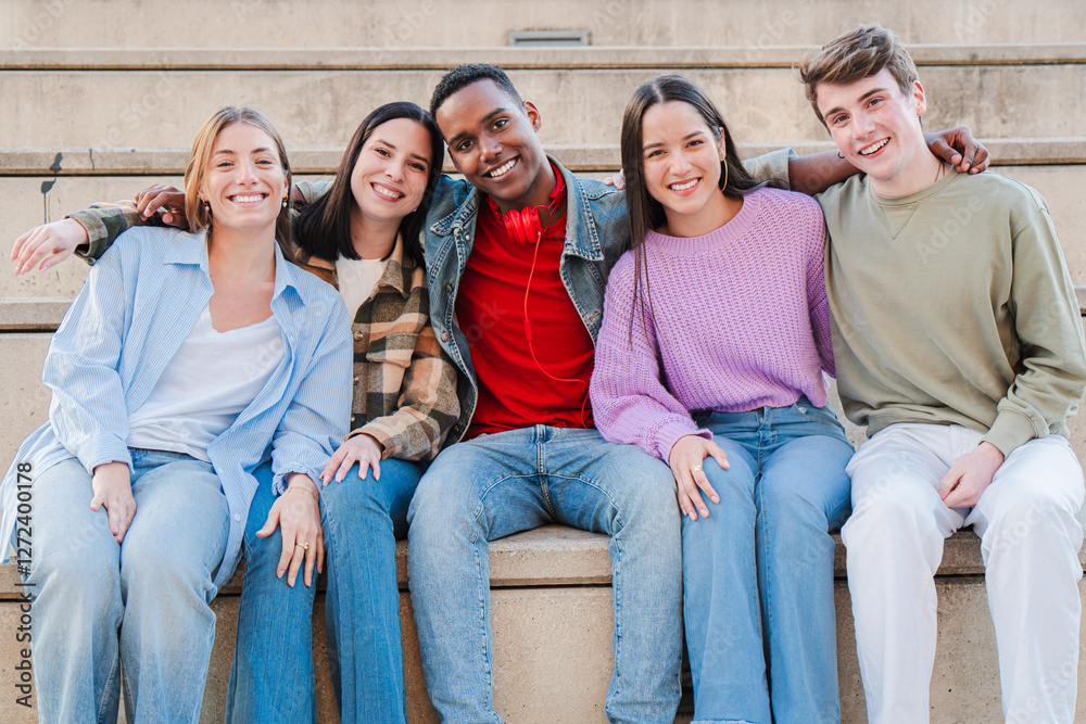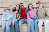 Joyful Group of Five Diverse Friends Enjoying Time Together While Sitting on Steps in a Relaxed Pose with Smiles and Laughter Captured in a Heartwarming Moment of Friendship and Togetherness