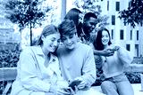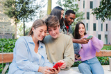Joyful Group of Young Friends Engaging with Their Cellphones While Sharing Exciting Moments and Laughter. Teens Focused on Their Mobile Phone, Enjoying Experiences and Creating Connections Together